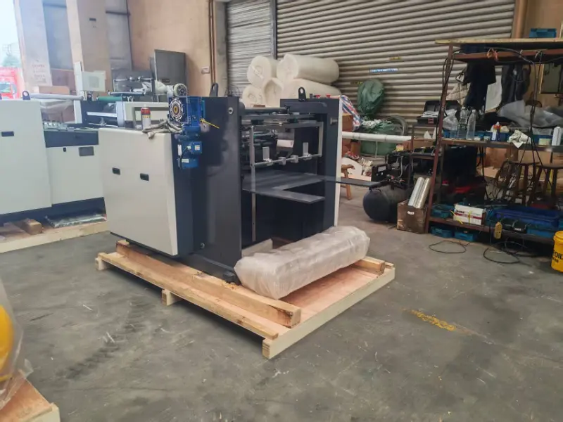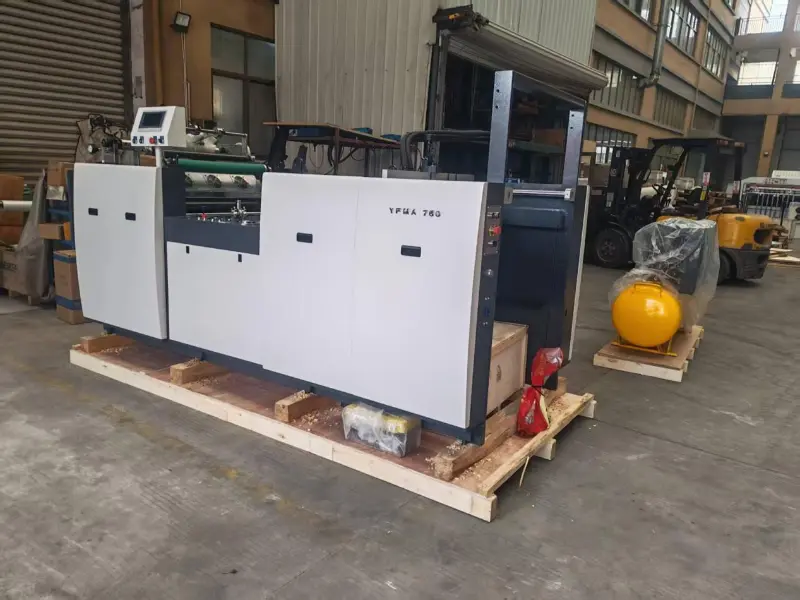 Vi pakker YFMA-760Automatisk Pre-Coating lamineringsmaskine, Endelig vil det blive pakket i en trækasse.